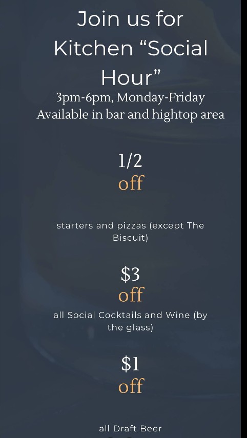 Kitchen Social is open on Monday, Tuesday and Wednesday from 3:00 PM - 9:00 PM; Thursday from 11:00 AM - 9:00 PM; Friday and Saturday from 11:00 AM - 10:00 PM; Sunday from 10:00 AM - 8:00 PM.